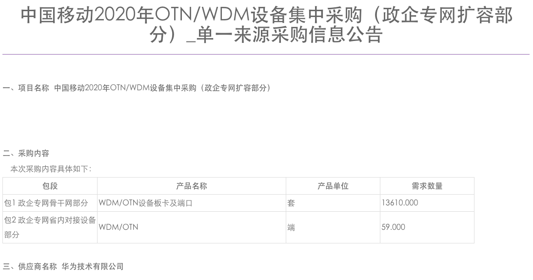中國(guó)移動(dòng)OTN/WDM設(shè)備政企專網(wǎng)擴(kuò)容集采:華為獨(dú)家入圍