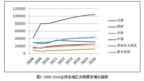 從拉動光纜需求的國家和地區(qū)分析:除北美地區(qū),其他地區(qū)的光纜需求量在2010至2016年均呈上升態(tài)勢。其中,東歐地區(qū)的年增長率保持在10%左右,為需求量增長最快地區(qū)。2010中國占全球光纜需求的44%。2011年占比有所下降,為42%,但中國仍是需求量最大的國家。預(yù)計(jì)2016年中國光纜需求將占全球市場的43%,需求超過1億芯公里(見圖1)。