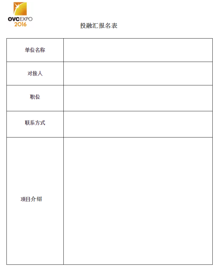 如果您對(duì)本次金融投資活動(dòng)感興趣,請(qǐng)盡快進(jìn)行報(bào)名,報(bào)名方式:填寫報(bào)名表,并通過電郵至組委會(huì)處。(Marketing@ovcexpo.com.cn)