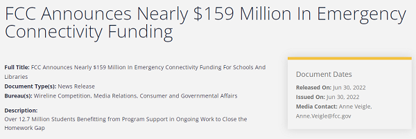 資金可以用于支持校外學習,如夜間作業(yè),以確保美國全國各地的學生獲得必要的支持,以跟上他們的教育。到目前為止,該項目已經幫助了超過1270萬名學生,支持了大約1萬所學校、900家圖書館和100個協(xié)會,并提供了1100多萬臺連接設備和500萬個寬帶連接。截至目前,已批準的近53億美元資助承諾中,有41億美元用于資助窗口一的申請,8.19億美元用于支持窗口二的申請,4.01億美元用于支持窗口三的申請。