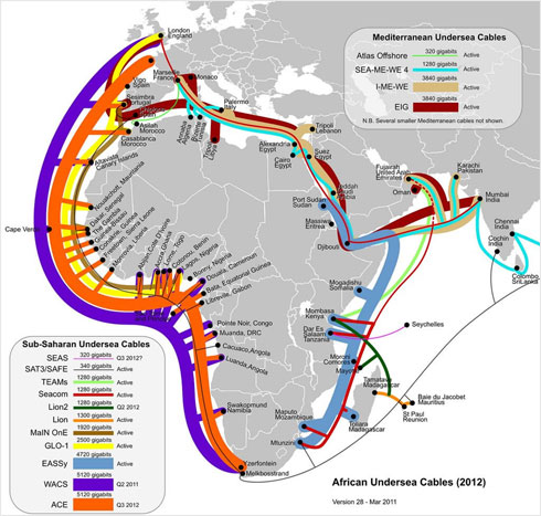 報告稱,海底光纜市場的關(guān)鍵增長驅(qū)動力是帶寬增長。目前非洲的互聯(lián)網(wǎng)滲透率比世界其他國家低。2015年,非洲的滲透率為29.52%,而其他地區(qū)近50%。這清晰表明非洲具有電信擴(kuò)張的重要潛力。伴隨非洲企業(yè)的增加數(shù)量,互聯(lián)網(wǎng)活動的需求必然增長。為了占據(jù)市場潛力,電信運營商和網(wǎng)絡(luò)服務(wù)供應(yīng)商需要提供滿足客戶對可靠電網(wǎng)及增加帶寬等需求的產(chǎn)品。2001年,非洲鋪設(shè)了第一條海纜—SAT-3/WASC 海底電纜。