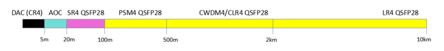 我們知道,QSFP28被認(rèn)為是100GbE光模塊的主流封裝。目前市場上有很多QSFP28產(chǎn)品,包括QSFP28DAC無源高速線纜、QSFP28 AOC有源高速線纜、以及不同接口的QSFP28光模塊,如100GSR4/LR4/PSM4/CWDM4光模塊等。在這些QSFP28光模塊中,對于您的100GbE網(wǎng)絡(luò)來說,哪個是最合適的呢?這取決于幾個因素,最基本的因素可能是您可能想要達(dá)到的傳輸距離和計劃使用的光纜類型。本文將重點講下100GBE網(wǎng)絡(luò)如何選擇合適的QSFP28光模塊產(chǎn)品。