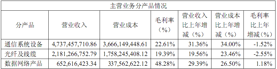 分產(chǎn)品情況來看,報告期內(nèi),上半年烽火的通信系統(tǒng)設(shè)備營收47.4億,同比增長31.36%,毛利率達(dá)22.61%;光纖線纜營收21.8億,同比增長19.56%,毛利率19.39%;數(shù)據(jù)網(wǎng)絡(luò)產(chǎn)品營收6.52億,同比增長29.39%,毛利率48.28%。