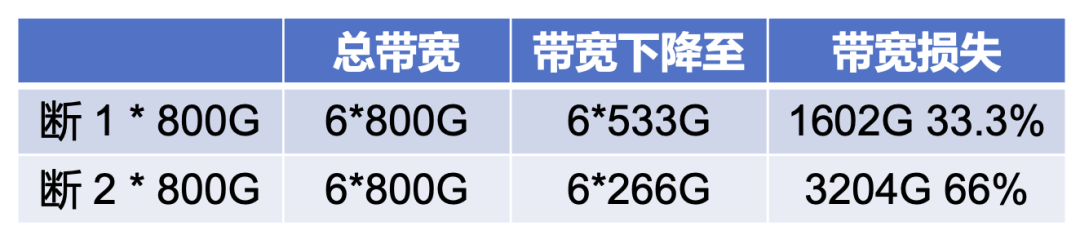 在小規(guī)模網(wǎng)絡(luò)集群中,設(shè)備間通常存在多鏈路互聯(lián),帶寬具有對稱性。如圖 5 所示的拓?fù)?,?dāng)一條 800G 鏈路斷開時(shí),理想情況下業(yè)務(wù)帶寬也應(yīng)相應(yīng)損失 800G。然而在實(shí)際場景中(如圖 6 所示),由于 BGP 路由仍然可達(dá),且傳統(tǒng)負(fù)載均衡無法感知全局拓?fù)渥兓?,?dǎo)致業(yè)務(wù)帶寬損失被不成比例地放大,損失值可能是物理帶寬損失的數(shù)倍,最高可達(dá) 32 倍。