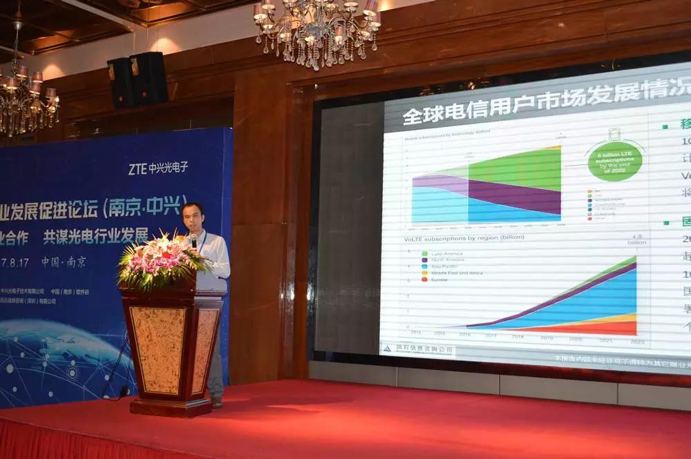 ICCSZ訊 8月17日,中興通訊以“光電子產(chǎn)業(yè)合作發(fā)展與技術交流”為主題,在南京成功舉辦2017光電子產(chǎn)業(yè)發(fā)展促進論壇。本次光電子產(chǎn)業(yè)發(fā)展促進論壇由中興光電子技術有限公司和中國(南京)軟件谷主辦、訊石信息咨詢(深圳)有限公司協(xié)辦,南京市政協(xié)副主席、雨花臺區(qū)委書記兼中國南京軟件谷工委書記黃河,中興通訊高級副總裁陳杰、中興光電子總經(jīng)理徐勇積以及來自國內(nèi)外的120余家通信企業(yè)的280余名代表出席了論壇。共計16位光通信領域的知名企業(yè)和學術界專家教授代表在論壇上發(fā)表了主題演講。