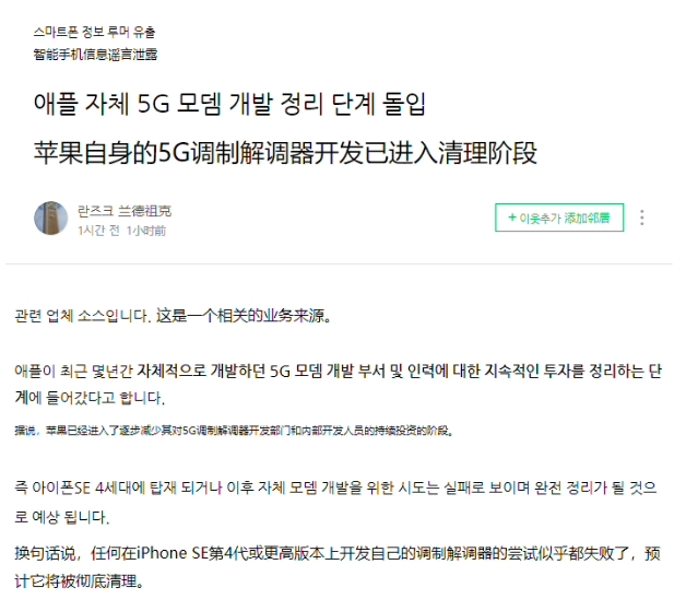 據(jù)韓國(guó)門(mén)戶網(wǎng)站 Naver 博客上的新聞聚合賬號(hào)“yeux1122”運(yùn)營(yíng)者稱,與蘋(píng)果公司 5G 調(diào)制解調(diào)器部門(mén)相關(guān)的供應(yīng)鏈消息人士透露,該公司自主研發(fā)調(diào)制解調(diào)器的嘗試迄今都沒(méi)有成功,蘋(píng)果公司正在結(jié)束這個(gè)持續(xù)多年的投資項(xiàng)目。另外,爆料者 @Tech_Reve 也表示,從日本的供應(yīng)鏈消息人士那里聽(tīng)到了類似的消息。