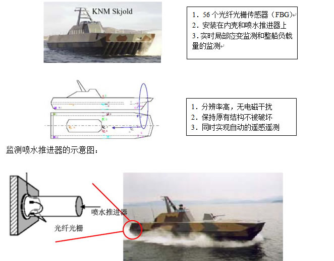 1999年春,美國海軍研究實驗室(Naval Research Laboratory, NRL)光纖靈巧結構部的Michael Todd等人用光纖傳感系統(tǒng)對KNM Skjold 快速巡邏艇進行智能監(jiān)測。