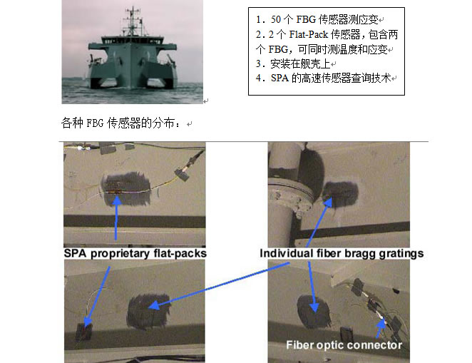 2002,2 美國海軍研究中心(Navy office of Naval Research)和海上戰(zhàn)爭中心(Naval Surface Warfare Center, Carderock Division)在英國皇家RV Triton艦船上安裝了光纖傳感系統(tǒng)對其進行艦船結構健康監(jiān)測。SPA安裝了自己的艦船監(jiān)測系統(tǒng)和超過50個FBG傳感器安裝在艦殼上,同時存在電傳感器以驗證它的精度和性能。這個測試系統(tǒng)伴隨RV Triton在海上2個星期的海上航行測試,最后數(shù)據被NSWCCD 和 SPA分析,以指導RV Triton的工程改進。同時美國也非常有興趣將該傳感系統(tǒng)用在Trimaran(三艦并列)技術的發(fā)展中。