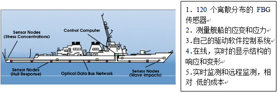 1999,10 在美國海軍實驗室的資助下,Systems Planning and Analysis Inc.制作了一個低成本的,用于監(jiān)測美國海軍艦船的結構和理性的光纖網絡。在這個系統(tǒng)中,通過分布在艦船外殼上的傳感點,可以實時的計算和報告艦船在海洋中作業(yè)時的受力情況。這個遠程監(jiān)測技術能夠為艦船的設計的修改和升級提供指導,同時對艦船的完整性有預警功能。