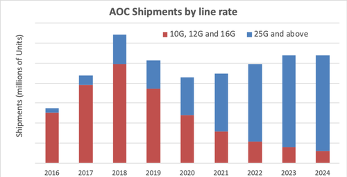 ICCSZ訊(編譯:Nina)根據(jù)LightCounting(LC)的最新預(yù)測,盡管AOC(有源光纜)產(chǎn)品多樣化,但從2020年到2024年,將近2/3的AOC出貨將來自兩種產(chǎn)品--1*10G和1*25G。