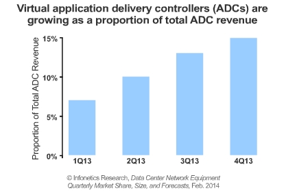 *應(yīng)用交付控制器虛擬設(shè)備市場將成為主流,在Q413其占應(yīng)用交付控制器市場14%的份額;