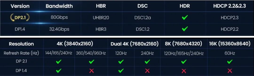 ● 16K 超清視覺:實(shí)現(xiàn)16K@60Hz(DSC)分辨率,超越傳統(tǒng)DP標(biāo)準(zhǔn),適用于專業(yè)與高端顯示場景。