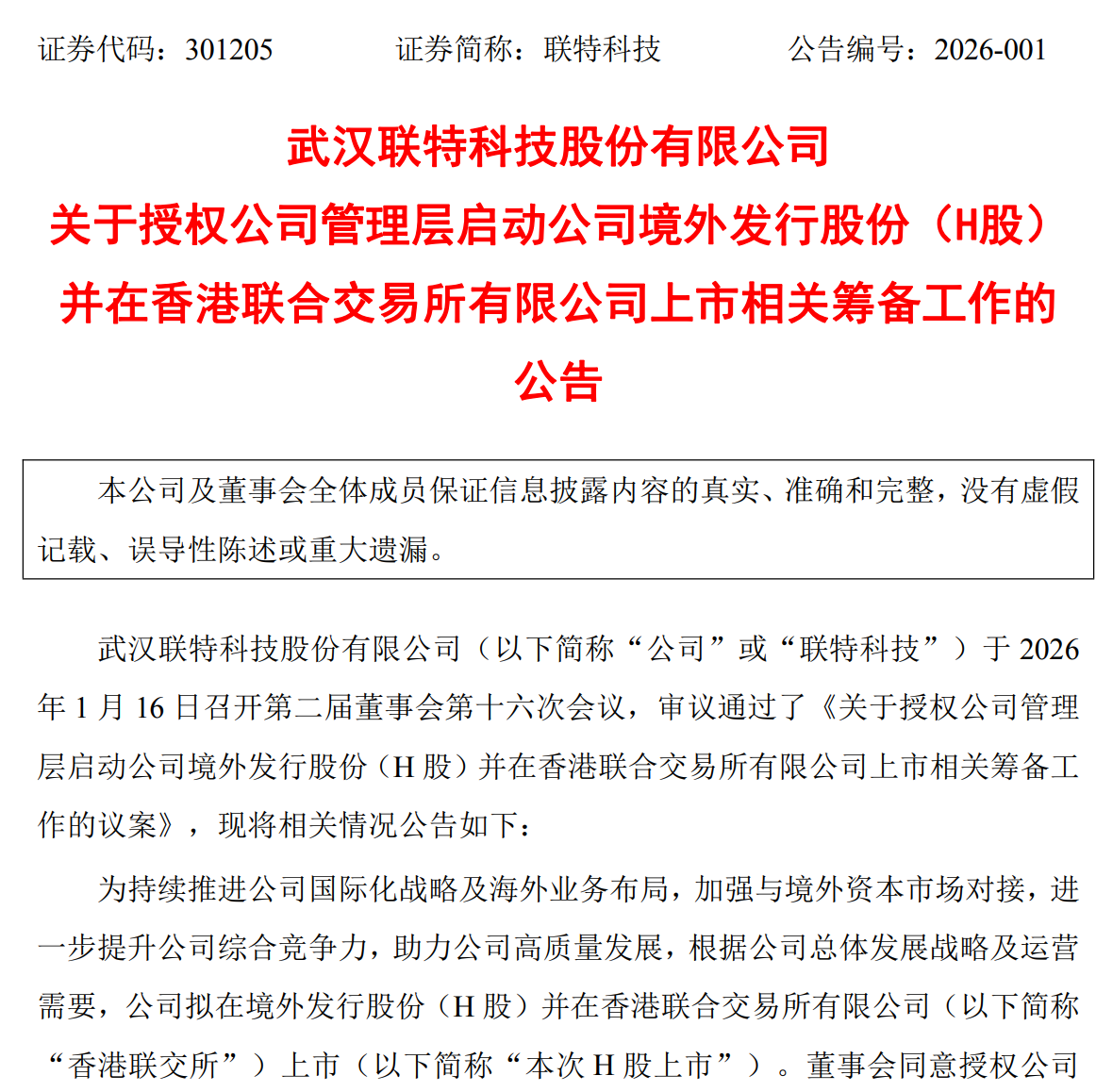 ICC訊 1月16日,武漢聯(lián)特科技股份有限公司(簡稱聯(lián)特科技)發(fā)布公告,聯(lián)特科技董事會啟動公司境外發(fā)行股份(H股)并在香港聯(lián)合交易所有限公司上市相關籌備工作。