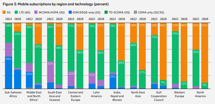 最新的愛立信移動報告還顯示,北美地區(qū)5G用戶的增長勢頭強于此前的預(yù)測。到2022年底,該地區(qū)的5G全球用戶滲透率最高,為41%。
