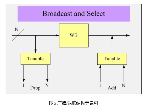 波長阻斷器用阻斷下路波長通過來實(shí)現(xiàn)功能,它可以支持較多的光通道數(shù)和較小的通道間隔,具有較低的色散,并可實(shí)現(xiàn)多個(gè)器件的級聯(lián),易于實(shí)現(xiàn)光譜均衡。但波長阻斷器需要額外的上下路模塊來構(gòu)建系統(tǒng),上下路配合可調(diào)濾波器和可調(diào)激光器。從本質(zhì)上講,WB是一個(gè)二維器件,通常在構(gòu)建系統(tǒng)中由多個(gè)分立器件構(gòu)成,體積較大,但可以支持100GHz和50GHz的波道間隔,并且技術(shù)成熟,成本較低,因此適合用于LH和ULH系統(tǒng)。圖2所示的是廣播/選取結(jié)構(gòu)示意圖。