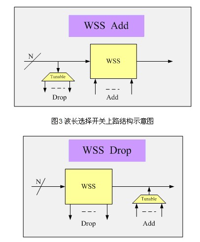 波長選擇交換器(WSS)是近年來發(fā)展迅速的ROADM子系統(tǒng)技術(shù)。WSS基于MEMS光學(xué)平臺,具有頻帶寬、色散低,并且同時(shí)支持10/40Gbit/s光信號的特點(diǎn)和內(nèi)在的基于端口的波長定義(Colorless)特性。采用自由空間光交換技術(shù),上下路波數(shù)少,但可以支持更高的維度,集成的部件較多,控制復(fù)雜?;赪SS的ROADM逐漸成為4度以上ROADM的首選技術(shù)。圖3、圖4所示的是波長選擇開關(guān)上下路結(jié)構(gòu)示意圖。