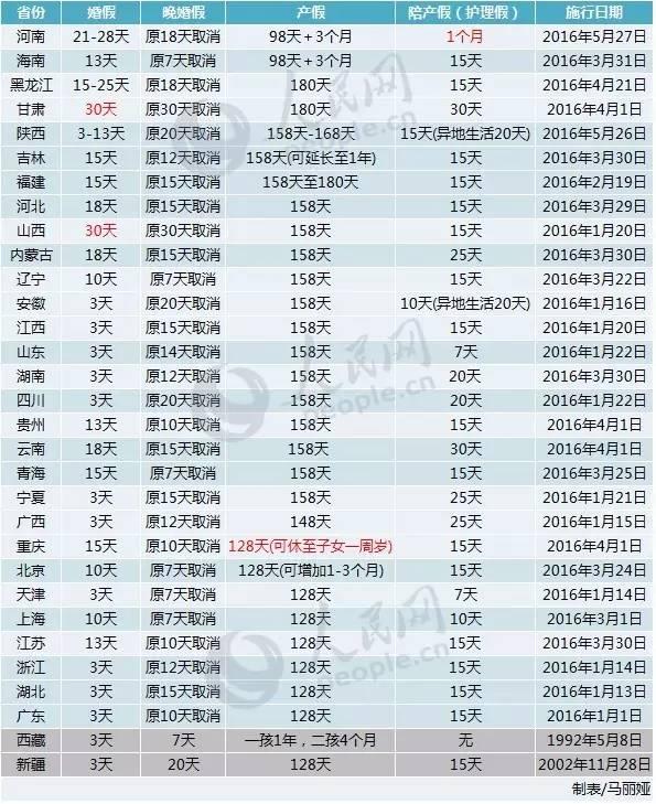 今年1月全國(guó)新修計(jì)生條例后各地產(chǎn)假排行。人民網(wǎng)7月制表