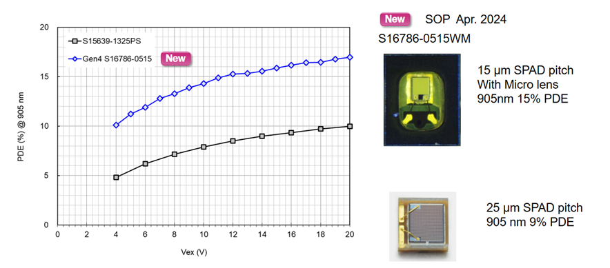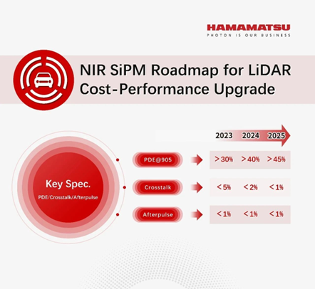 濱松持續(xù)升級NIR SiPM的性能,推動905 nm和940 nm激光雷達(dá)以更低的成本達(dá)到1550 nm激光雷達(dá)測距效果,300 m@10%反射率。
