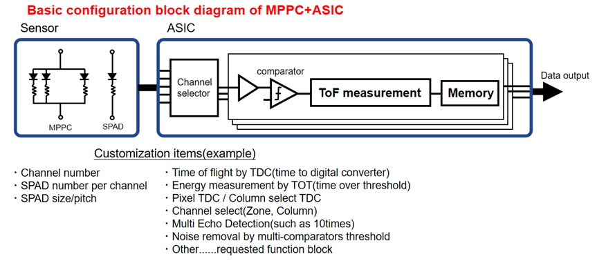 就通道數(shù)和單通道成本而言,采用TCSPC測距原理的SPAD方案確實在高線數(shù)激光雷達(dá)(≥196線)應(yīng)用中表現(xiàn)出獨特的優(yōu)勢。然而,濱松認(rèn)為,在方案集成度上,SiPM+ASIC方案同樣能夠達(dá)到與SPAD+ASIC相媲美的效果。