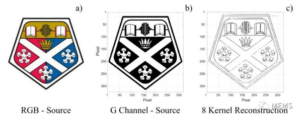 為了進(jìn)一步測試該系統(tǒng)的能力,研究人員選擇了一幅更復(fù)雜的源圖像,即思克萊德大學(xué)(UoS)的323? × 323?像素RGB圖像。結(jié)果表明,所有水平線、垂直線和對角線均被識別,進(jìn)一步說明圖像大小和復(fù)雜性均不會妨礙基于光子脈沖VCSEL的邊緣檢測系統(tǒng)的操作。重要的是,實(shí)現(xiàn)了96.63%的整體邊緣檢測精度。我們必須注意,每個像素的時間可以進(jìn)一步減少到僅1ns(VCSEL神經(jīng)元的脈沖耐受時間),而無需任何額外的優(yōu)化過程,以實(shí)現(xiàn)更快的處理速度。