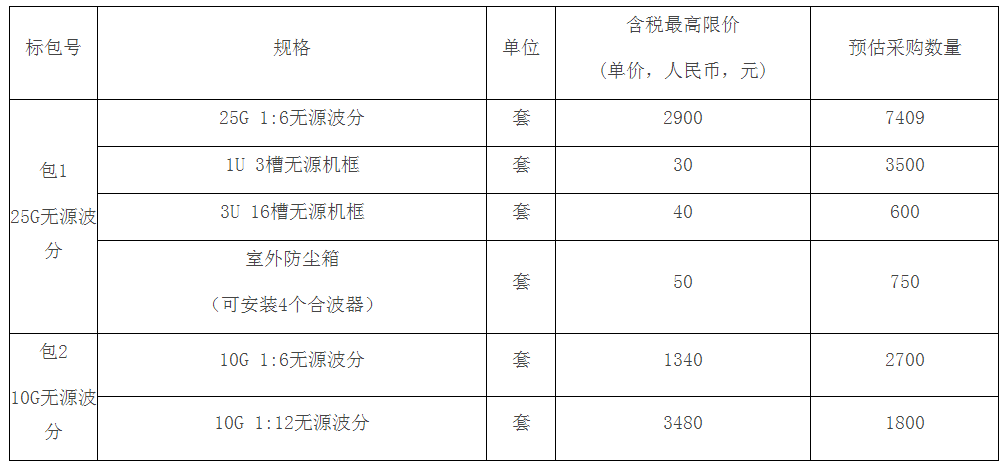 根據(jù)之前招標(biāo)公告,本次采購(gòu)內(nèi)容包括:標(biāo)包1為無(wú)源光纖復(fù)用設(shè)備個(gè)7409套和無(wú)源光纖復(fù)用設(shè)備配件個(gè)4850套,標(biāo)包2無(wú)源光纖復(fù)用設(shè)備4500套。