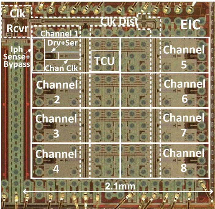 圖 5. PIC 28-nm EIC 的顯微照片,帶時鐘、8 個 TX 通道和注釋的單通道細節(jié) [1]。