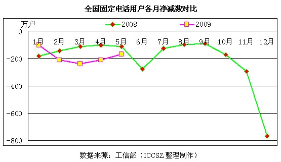 2009年1~5月,全國固定電話用戶減少927.0萬戶(其中無線市話用戶減少800.7萬戶),用戶總數(shù)降至3.32億戶;其中,在前三個月,固話用戶流失速度不斷加快,從四月份開始,用戶流失速度有所減慢,五月的用戶流失數(shù)進(jìn)一步降低,凈流失量降至167.5萬戶。