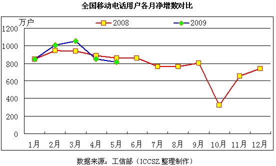 移動電話用戶方面,2009年1~5月,移動電話用戶增加4571.9萬戶,用戶總量達(dá)6.87億戶,其中,在09年的前三個月,移動用戶增長速度不斷加快,四月和五月的用戶增長速度明顯放緩,五月份的凈增量降至814.7萬戶,是09年增長最慢的月份。從09年前五個月的表現(xiàn)來看,移動用戶增長快的月份,固話用戶的流失量也有所增長,這證明了移動通信與固話通信明顯的替代效應(yīng)。