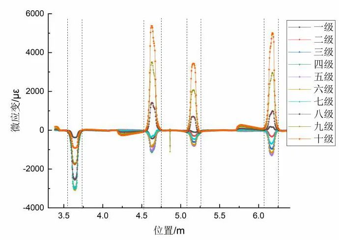 從剪切試驗應變曲線(見圖4)中可以發(fā)現(xiàn)四個明顯的峰值,從左到右依次代表左側(cè)、下側(cè)、右側(cè)和上側(cè)錯開處,每一級曲線中峰值大小隨加載級數(shù)增加而增大。觀察發(fā)現(xiàn)在左側(cè)接縫(3.64m)處的峰值為負值,分析是在粘貼光纖時自由段光纖未進行足夠預拉,導致試驗過程中自由段光纖發(fā)生收縮,在應變數(shù)據(jù)上體現(xiàn)為負值。完整測試過程及結(jié)果,詳見基于OFDR的不連續(xù)管道豎向錯開變形定量監(jiān)測。
