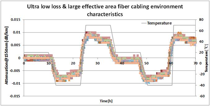 由可以發(fā)現(xiàn),當溫度在-40℃-70℃的范圍內(nèi)變化時,我們的超低衰減大有效面積(110μm2)光纜的衰減變化小于0.01dB/km,遠遠優(yōu)于IEC和ITU-T標準規(guī)定的0.05dB/km。