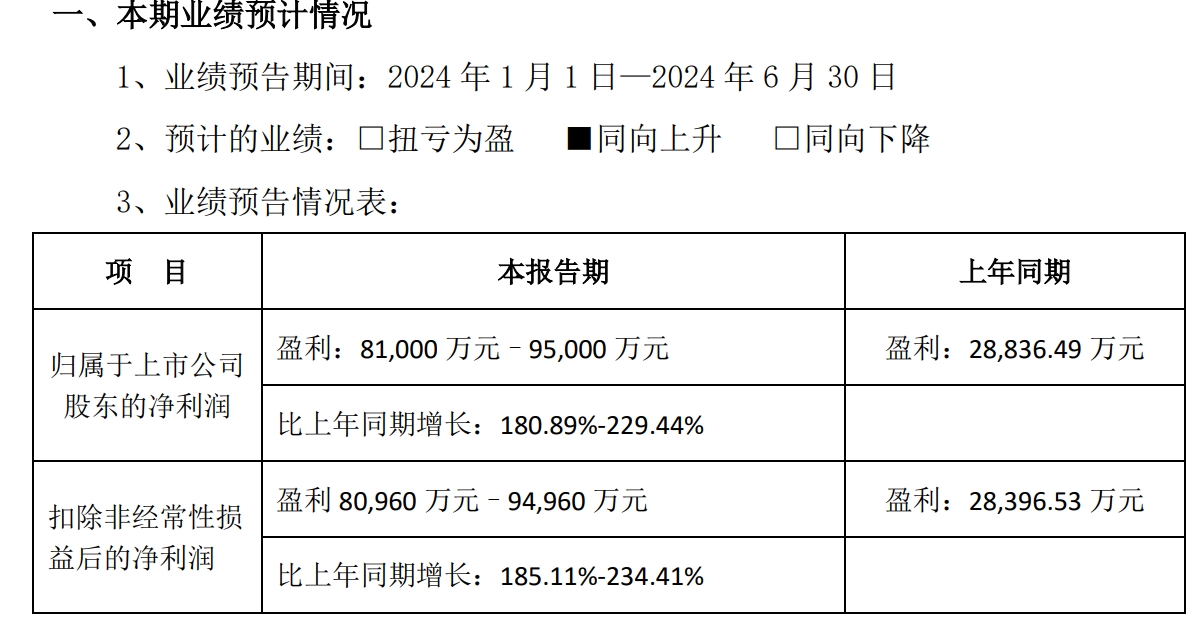 ICC訊 近日,成都新易盛通信技術(shù)股份有限公司(簡(jiǎn)稱新易盛)發(fā)布2024年半年度業(yè)績(jī)預(yù)告,公司預(yù)計(jì)歸屬于上市公司股東的凈利潤(rùn)81,000萬(wàn)元–95,000萬(wàn)元,比上年同期增加180.89%-229.44%,公司受益于行業(yè)景氣度持續(xù)提升,高速率產(chǎn)品需求快速增長(zhǎng),預(yù)計(jì)銷售收入和凈利潤(rùn)較上年同期大幅增加。