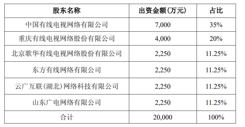 ICCSZ訊 據(jù)歌華有線19日晚間發(fā)布公告稱,北京歌華有線電視網(wǎng)絡(luò)股份有限公司已于7月18日與中國有線電視網(wǎng)絡(luò)有限公司、重慶有線電視網(wǎng)絡(luò)股份有限公司、東方有線網(wǎng)絡(luò)有限公司、云廣互聯(lián)(湖北)網(wǎng)絡(luò)科技有限公司、山東廣電網(wǎng)絡(luò)有限公司共同簽署了《寬帶業(yè)務(wù)運(yùn)營公司發(fā)起人協(xié)議》,公司擬出資2,250萬元與上述五家公司共同發(fā)起設(shè)立全國性寬帶綜合業(yè)務(wù)運(yùn)營公司,持有該公司11.25%的股權(quán)比例。