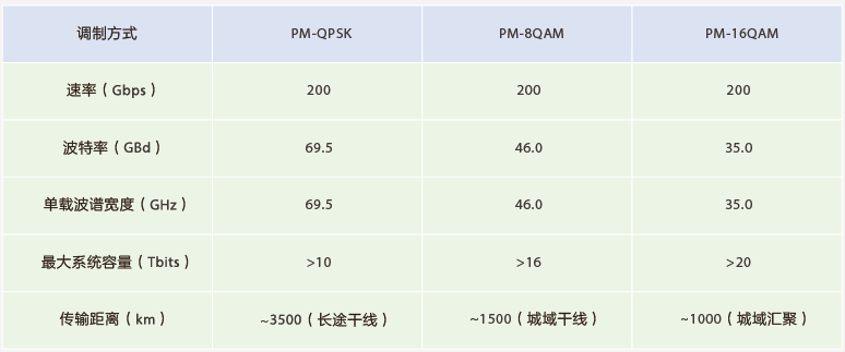 以高階調(diào)制技術(shù)為例,200Gbps光傳輸系統(tǒng)有多種實(shí)現(xiàn)方式,如PM-QPSK、PM-8QAM、PM-16QAM。不同調(diào)制碼型對(duì)應(yīng)的200Gbps業(yè)務(wù)性能和應(yīng)用場(chǎng)景如表1所示。
