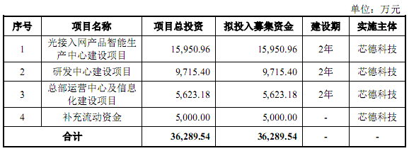 ICC訊 近日,廣州芯德通信科技股份有限公司(簡稱芯德通信)發(fā)布首次公開發(fā)行股票并在創(chuàng)業(yè)板上市招股說明書,擬發(fā)行股數(shù)不超過1061萬股,預(yù)計募集資金3.63億元,用于“光接入網(wǎng)產(chǎn)品智能生產(chǎn)中心建設(shè)項目”、研發(fā)中心建設(shè)項目、總部運營中心及信息化建設(shè)項目以及補充流動資金。