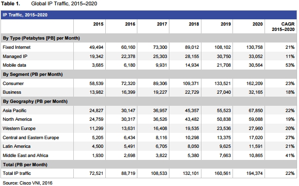 IP流量將從2015年的每月72.5EB增長至2020年的每月194.4EB。