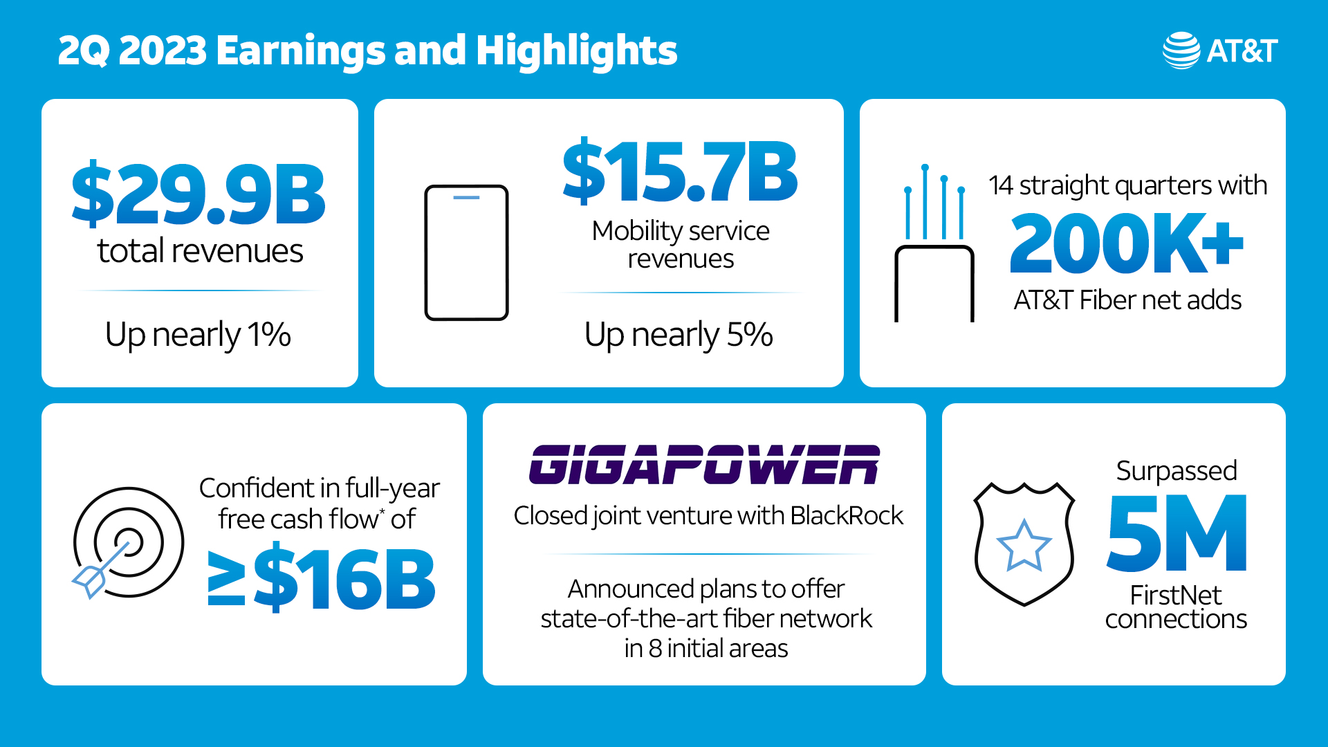ICC訊(編譯:Vicki)AT&T公布了截至2023年6月30日的第二季度財(cái)務(wù)業(yè)績(jī)。2023年第二季度,AT&T營(yíng)收299億美元,同比增長(zhǎng)0.9%。凈利潤(rùn)為47.62億美元,去年同期為45.37億美元。