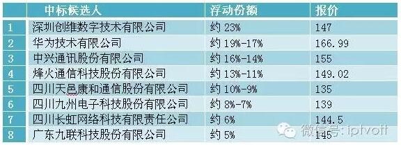 按地域分,8家候選企業(yè)有四家地處廣東,有三家則在四川,地域十分集中。三家四川企業(yè)占據(jù)了大約四分之一的份額,加之作為擁有超過900萬IPTV用戶的全球最大IPTV單局點,四川在中國IPTV史上寫下濃墨重彩的一筆。此外,三家四川企業(yè)占據(jù)8家候選人的低報價前三甲,其中四川天邑康和通信股份有限公司135元的報價即使在19家通過資格預審的企業(yè)里也是倒數(shù)第二低的,僅比最低報價123高;長虹在三家四川企業(yè)里報價最高份額最低;而不同于其他7家都有入圍電信集團IPTV機頂盒集采經(jīng)歷,奪得了約8%-7%的份額的四川九州則是首次入圍。