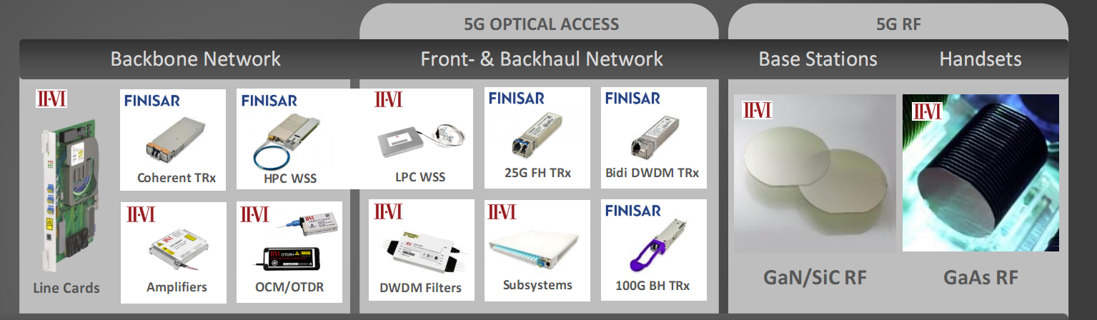 5G移動基礎(chǔ)設(shè)施講師未來增長的新機遇,II-VI與Finisar基于各自的技術(shù)平臺以及產(chǎn)品互補,使II-VI在5G光接入、5G射頻以及系統(tǒng)模塊方面成為全面的光電子器件供應(yīng)商。