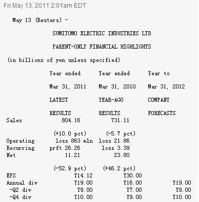 摘要:2011年5月17日消息,日本光通訊電纜大廠住友電工(Sumitomo Electric)于上周五公布其截至2011年3月31日的第一季度財(cái)務(wù)業(yè)績(jī)報(bào)告。住友電氣在該季度內(nèi)實(shí)現(xiàn)銷(xiāo)售收入8041.6億日元,比2010年同期的7311.1億日元增長(zhǎng)了約10%。