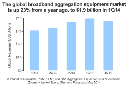 *2014年一季度全球?qū)拵гO備市場(DSL、PON和以太網(wǎng)FTTH)環(huán)比下降5%,同比上升23%,市場總值達到18.9億美元。