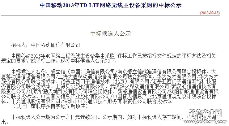 ICCSZ訊 最新消息,中國移動(dòng)無線主設(shè)備招標(biāo)結(jié)果日前在其采購與招標(biāo)網(wǎng)上進(jìn)行公示。其公示結(jié)果中顯示愛立信、大唐移動(dòng)、華為、諾西、上海貝爾、烽火通信、新郵通、普天、中興等9家企業(yè)(投標(biāo)聯(lián)合體)中標(biāo)。但其公告并未顯示各中標(biāo)企業(yè)的具體份額。記者聯(lián)系了幾家中標(biāo)廠商,但這些廠商均表示,在中移動(dòng)方面沒有公示比例前不能透露。不過,有接近中移動(dòng)人士對(duì)通信產(chǎn)業(yè)報(bào)(網(wǎng))記者透露,前不久所傳的比例屬實(shí)?! ?/p>