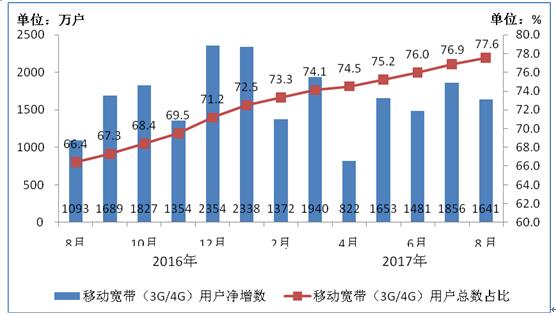 圖3 2016-2017年8月移動(dòng)寬帶用戶(hù)當(dāng)月凈增數(shù)和總數(shù)占比情況