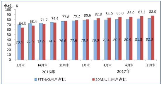 圖4 2016-2017年8月光纖接入(FTTH/O)和20Mbps及以上固定寬帶接入用戶(hù)占比情況