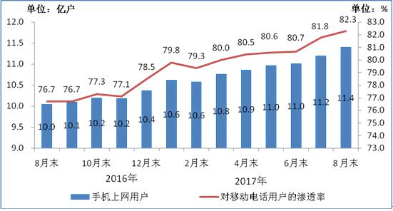 圖5 2016-2017年8月手機(jī)上網(wǎng)用戶(hù)和對(duì)移動(dòng)電話(huà)用戶(hù)滲透率情況