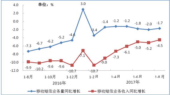 圖7 2016-2017年8月移動(dòng)短信業(yè)務(wù)量和收入同比增長(zhǎng)情況