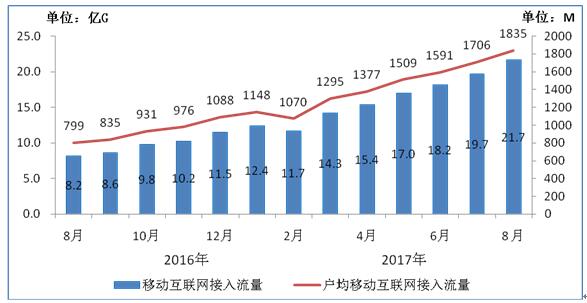 圖8 2016-2017年8月當(dāng)月移動(dòng)互聯(lián)網(wǎng)接入流量和戶(hù)均流量比較
