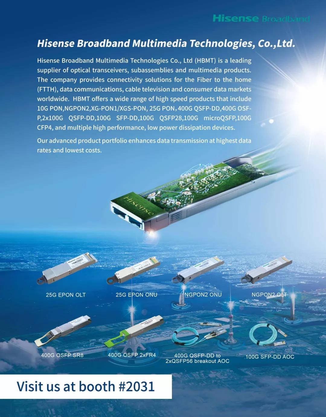 2018 OFC期間,海信寬帶會(huì)對(duì)100G SFP-DD AOC進(jìn)行現(xiàn)場(chǎng)演示。除此以外,海信寬帶還推出了基于PAM4技術(shù)的400G系列光模塊解決方案,包括400G QSFP-DD Transceiver/AOC,400G OSFP Transceiver/AOC,400G OSFP 2xFR4等產(chǎn)品,其中400G QSFP-DD AOC,400G OSFP SR8和400G OSFP 2xFR4產(chǎn)品均在海信寬帶展區(qū)進(jìn)行現(xiàn)場(chǎng)演示。