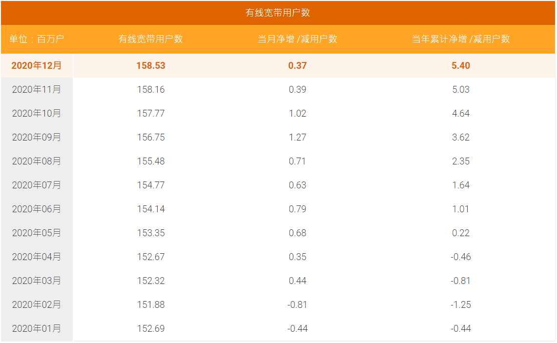 有線寬帶業(yè)務(wù)方面,當月,中國電信有線寬帶用戶數(shù)凈增37萬戶,全年有線寬帶用戶累計凈增540萬戶,有線寬帶累計用戶數(shù)1.5853億戶。固定電話業(yè)務(wù)方面,當月中國電信固定電話用戶數(shù)凈減9萬戶,固定電話累計用戶數(shù)1.0788億戶。