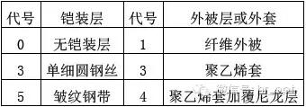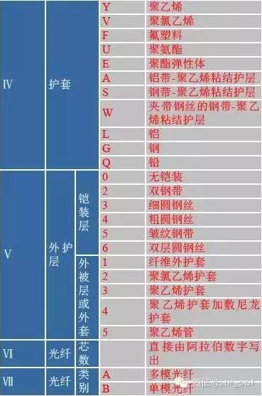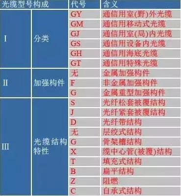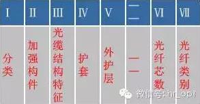 光纜的型式由五個(gè)部分組成,如下所示。各部分均用代號(hào)表示。