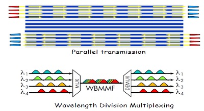 傳統(tǒng)的多模光纖一般采用串行傳輸模式,在這種模式下增加以太網(wǎng)的傳輸速率必須增加每芯光纖/通道的傳輸速率。目前以太網(wǎng)最大串行傳輸速率為10Gbps/通道,IEEE正在制定25Gbps/通道,50Gbps/通道的網(wǎng)絡(luò)標(biāo)準(zhǔn),以400G以太網(wǎng)為例,會(huì)有25Gbps/通道, 50Gbps/100Gbps通道3個(gè)不同的版本,光纖芯數(shù)分別需要32芯/16芯/8芯。400G以太網(wǎng)采用的編碼方式有NRZ,PAM4,DMT,更高級(jí)的編碼方式意味著更復(fù)雜的電路和功耗,因而成本更高。
